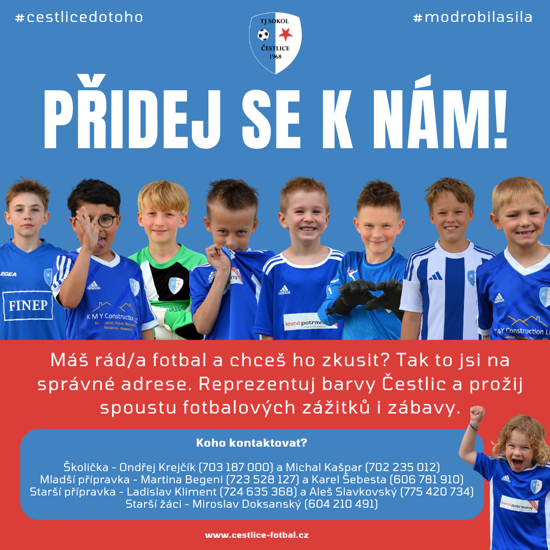 Máš rád/a fotbal a chceš si ho zkusit? Tak to jsi na správné adrese. Reprezentuj modrobílé barvy TJ Sokol Čestlice a prožij spoustu fotbalových zážitků i zábavy. Kontakty na trenéry jednotlivých kategorií najdeš v přiloženém letáčku výše.